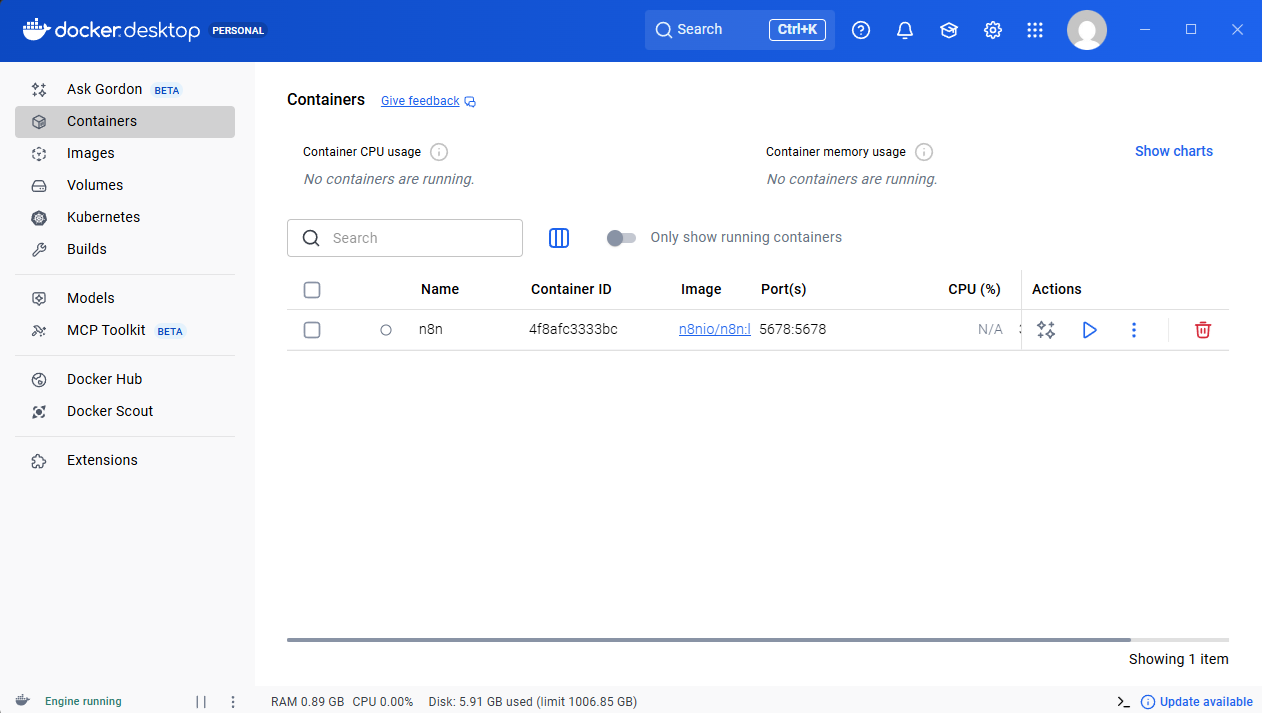 docker run -it --rm --name n8n -p 5678:5678 n8nio/n8n