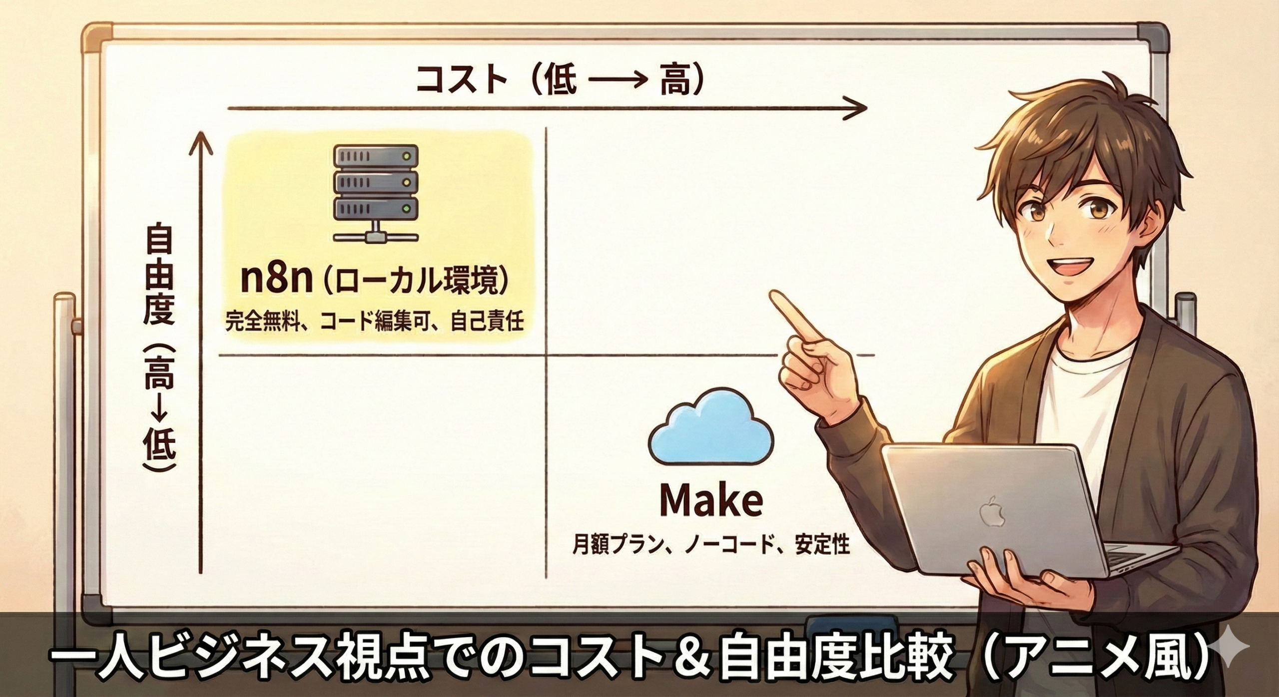 n8n(ローカル): 自分のPCで動かす限り、何回実行しても「0円(無料)」です。この「タダで試行錯誤し放題」という環境こそが、一人の戦いには不可欠です。